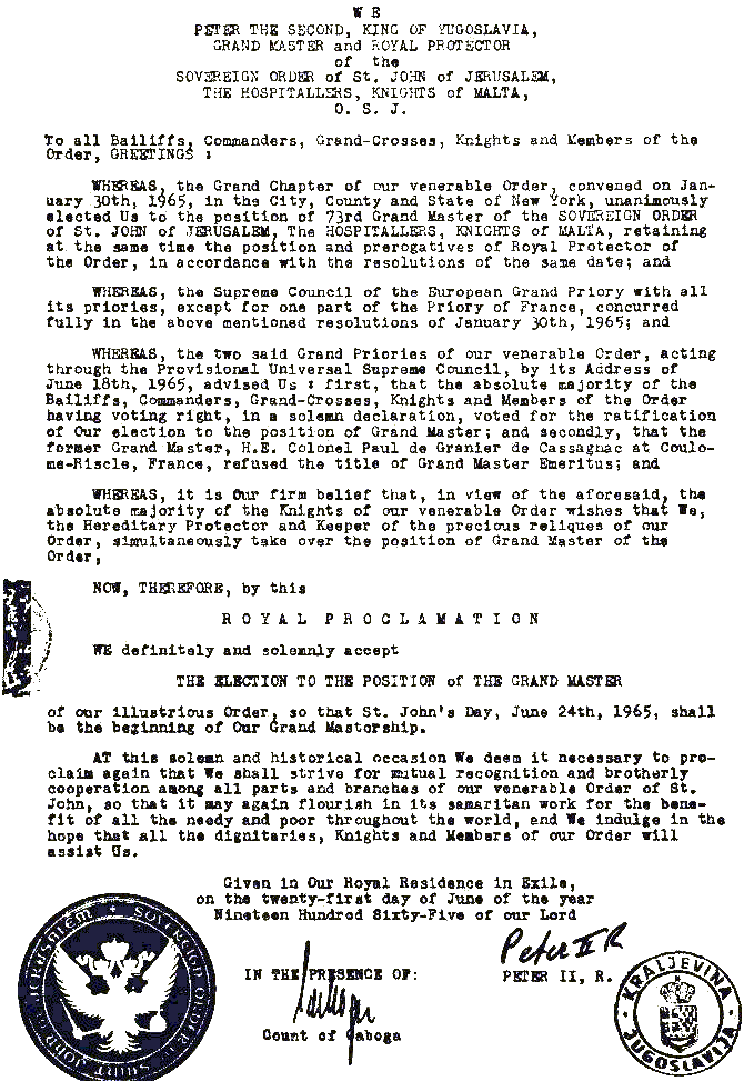 King Peter wears the insignia of the Sovereign Order of St John, Knights of Malta, of which he became Protector in 1962 and Grand Master in 1965.