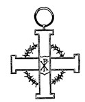 22. The Cross (Star) of the Order is a Cross of Jerusalem in white enamel edged with gold, surmounted by a shield of blue enamel bearing the monogram of Christ (the Chi-Rho) in gold, and surrounded by a Crown of Thorns also in gold. The ribbon is watered red with narrow white edges.